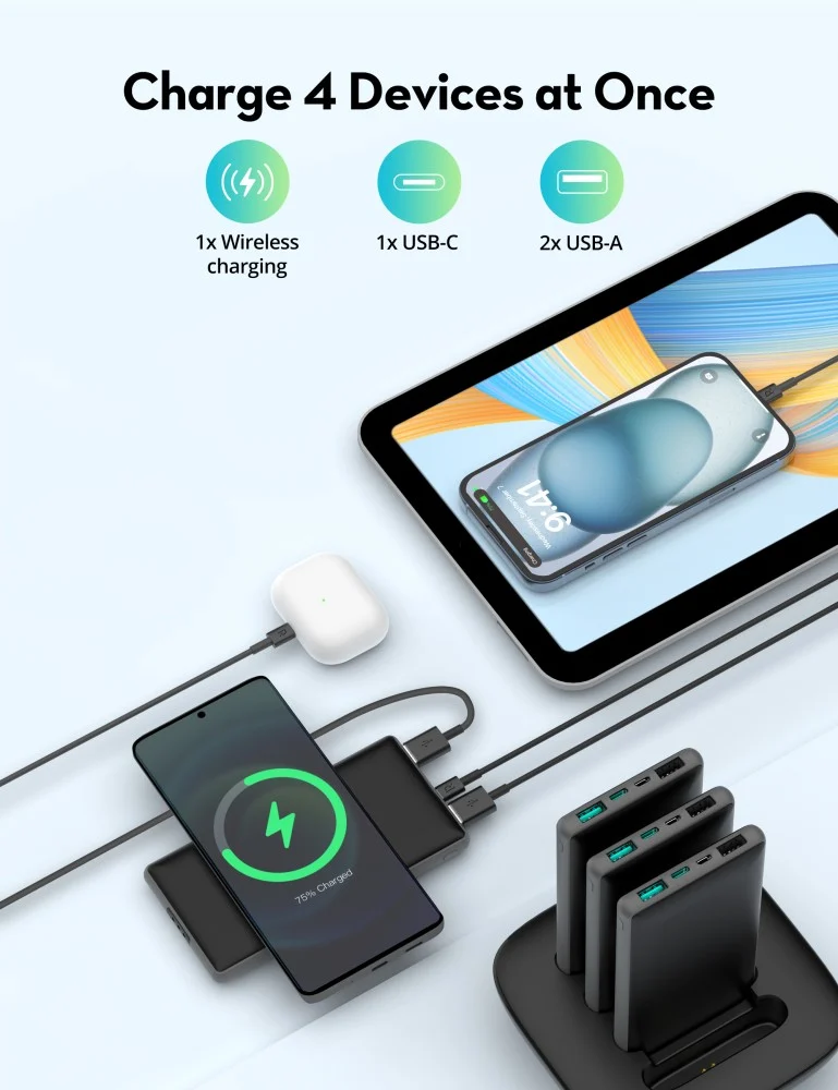 •  تضم منافذ Type-C، Lightning، Micro USB، وUSB-A مما يسمح لك بشحن جميع أنواع الأجهزة في وقت واحد، من الجوالات إلى السماعات الذكية.